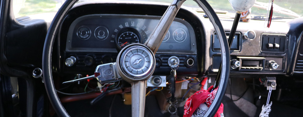 During the rebuild the owner took the opportunity to move the shifter from three on the tree to three on the floor so the long outlaw style shifter could be added with a skull at the top.